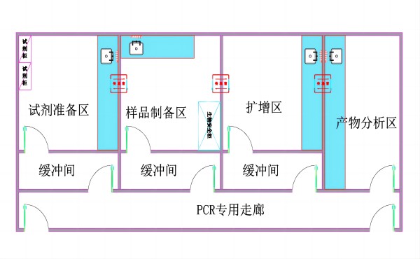 实验室较为理想的布局模式为有一个专用走廊,试剂准备区、样品制备区、扩增区和产物分析区很规范地排列在一起,前三个区各有一个缓冲间,可供换工作服和工作鞋使用,顶上可装一紫外灯。内实验区域设为正压或常压状态,缓冲间内设为负压状态(可上设一抽风装置),使这三个区的空气流向为由实验区域内向外,缓冲间内通向实验室和走廊的门可安装一种连锁装置,当一个门打开时,另一门必须处于关闭状态,防止出现两个门同时打开的情况。产物分析区可不设缓冲间,但应设为负压状态(装一个排风扇即可),使空气流向由外向内,以防止扩增产物的随空气流出。每一区域都必须有明确的标记,工作按试剂准备区、样品制备区、扩增区至产物分析区单一流向进行,各区的仪器设备包括工作服、鞋、实验记录本和笔都必须专用。